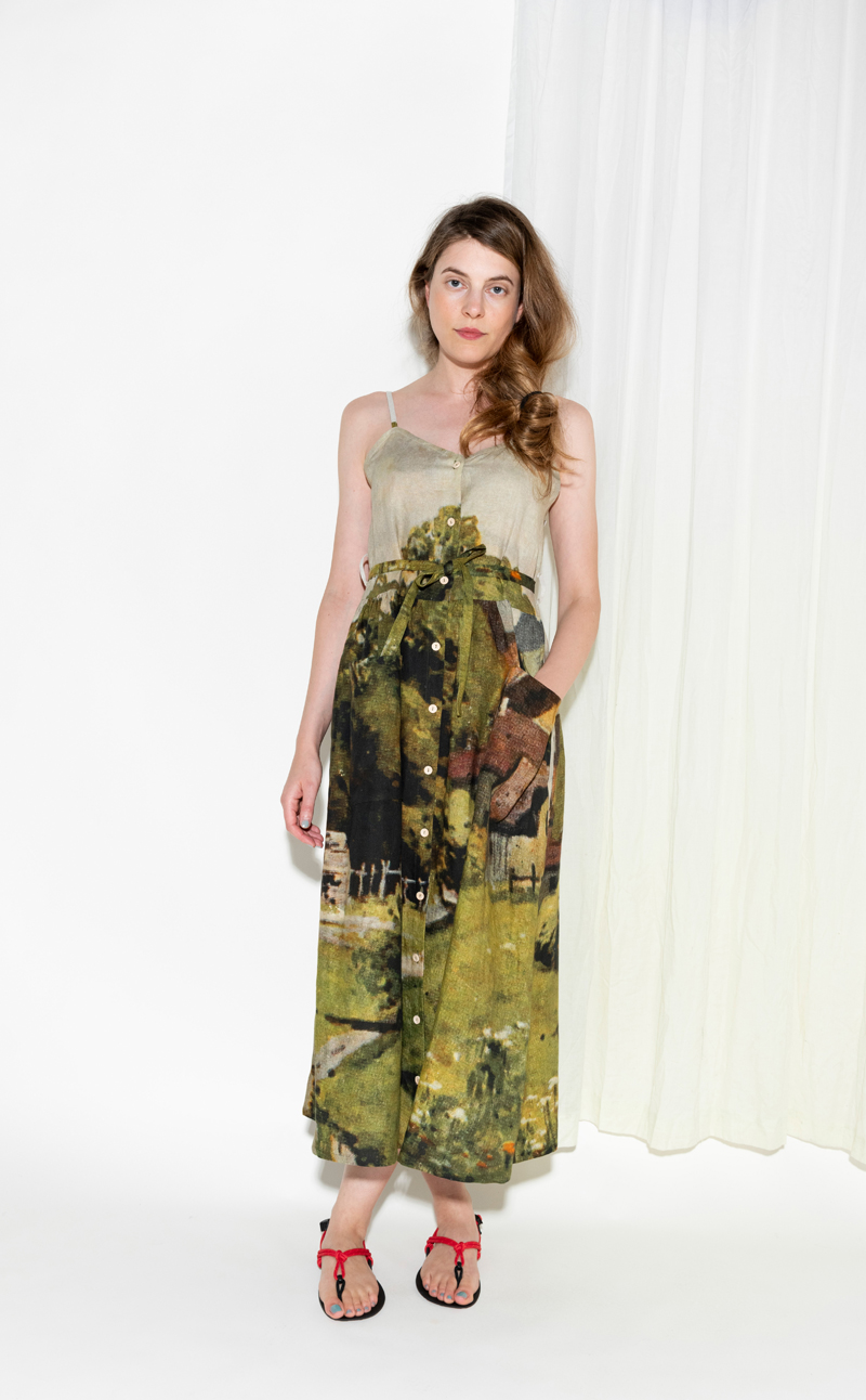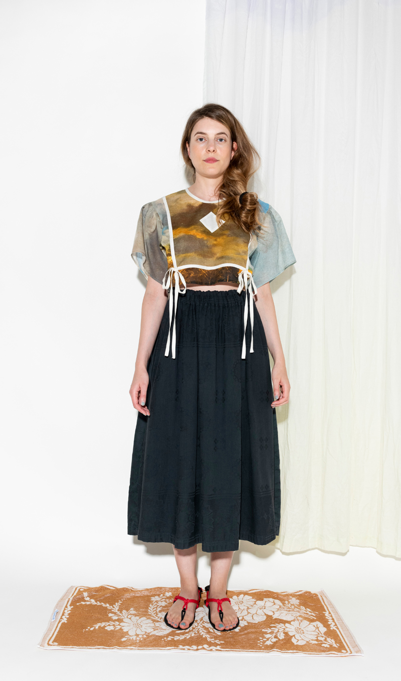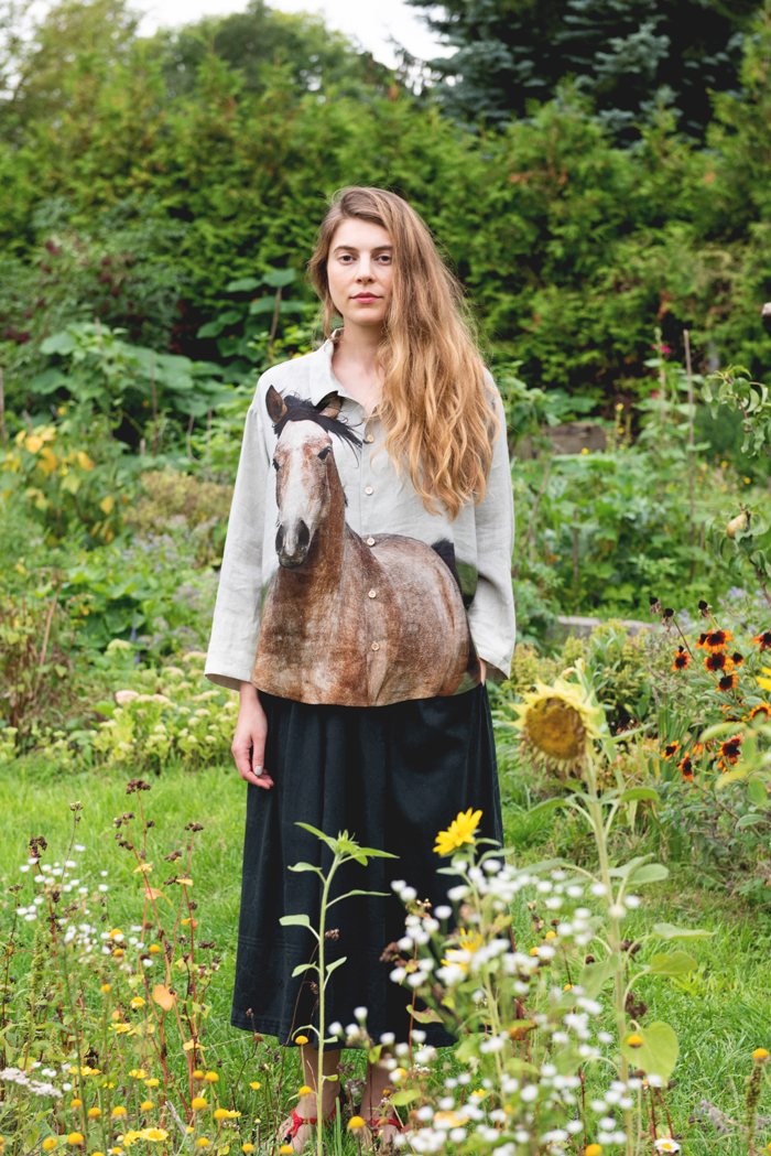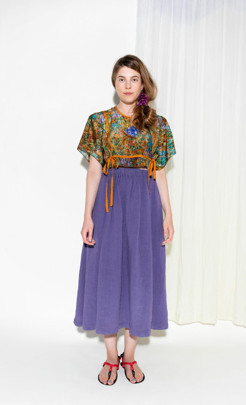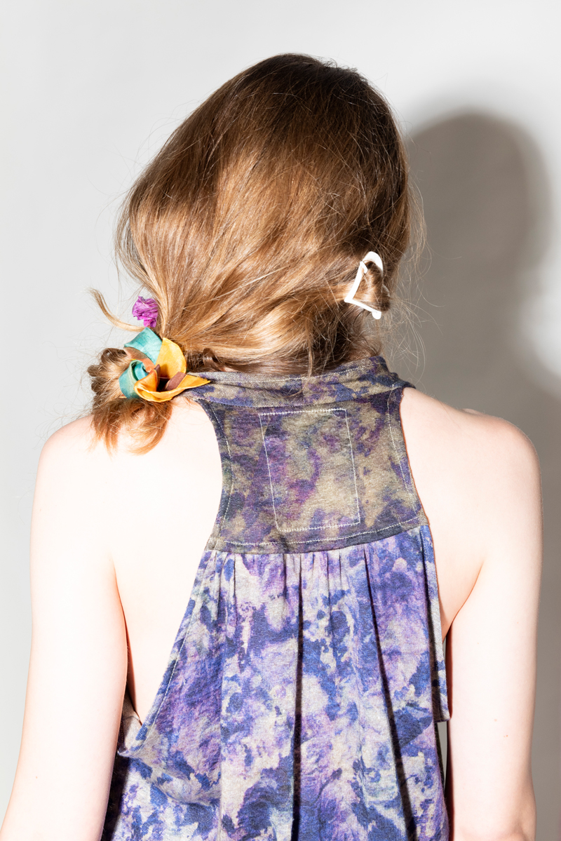 Within the Line we’ve been working on historic folk silhouettes that we interpreted in combination with modern, pure, comfortable and easy patterns. The materials show entirely natural fibres, with haptics that we see as modern and nice wear. Details: hand-embroidery, a new Natural Plisse Fabric combining cotton and silk. Including the ongoing Upcycling Project Materials, we’re proud to present a sequence of natural flower bundle-dyed items. Furthermore we’ve been using bio degradable Tencel yarn for most dyed items.