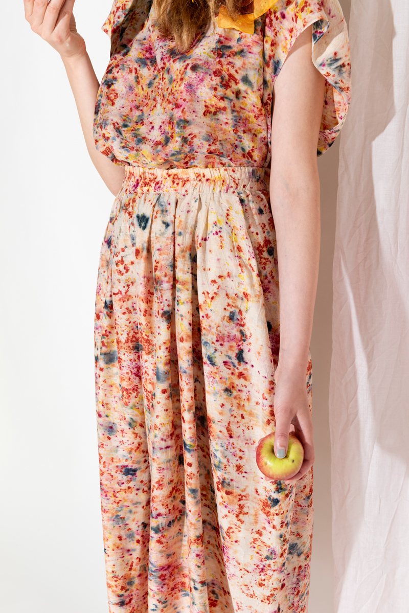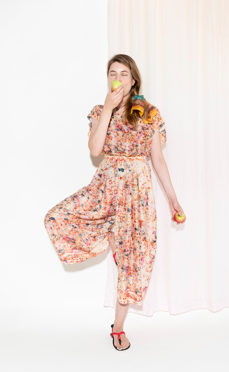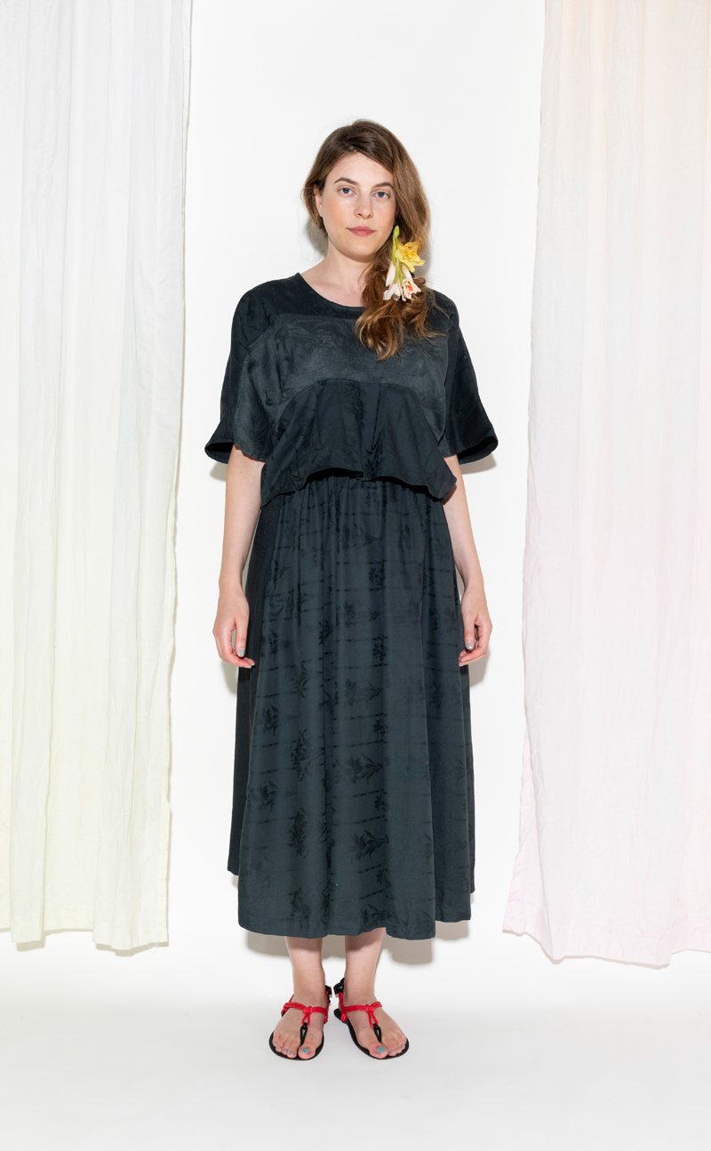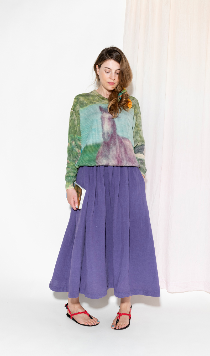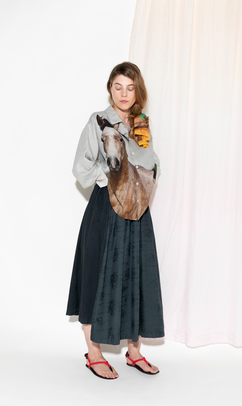 Within the Line we’ve been working on historic folk silhouettes that we interpreted in combination with modern, pure, comfortable and easy patterns. The materials show entirely natural fibres, with haptics that we see as modern and nice wear. Details: hand-embroidery, a new Natural Plisse Fabric combining cotton and silk. Including the ongoing Upcycling Project Materials, we’re proud to present a sequence of natural flower bundle-dyed items. Furthermore we’ve been using bio degradable Tencel yarn for most dyed items.